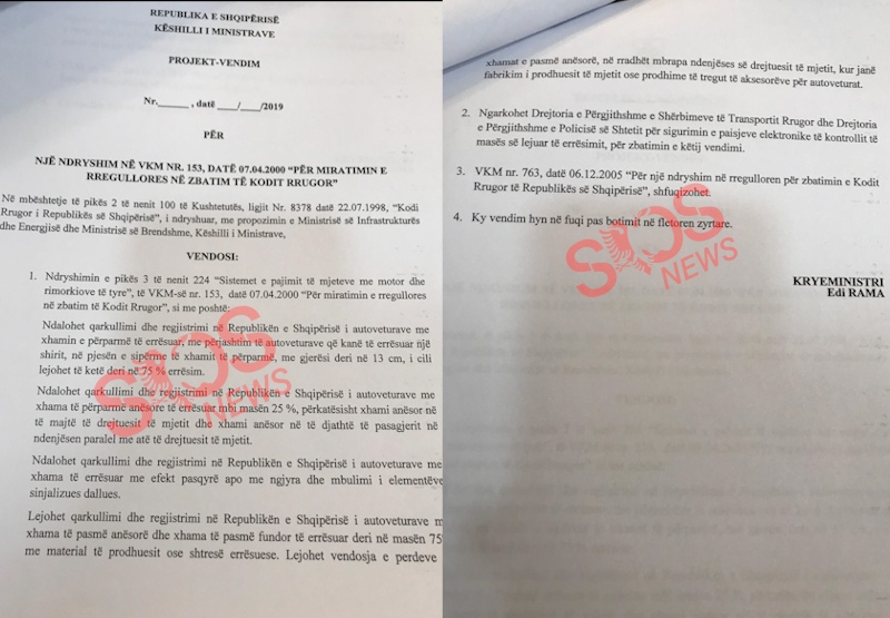 Ky projekt vendim ngarkon me detyra specifike Drejtorinë e Transportit Rrugor dhe Policinë e Shtetit për sigurimin e pajisjeve elektronike të kontrollit të masës së lejuar të errësimit, për zbatimin e këtij vendimi. Gjithashtu parashikon që VKM nr.763, datë 06.12.2005 “Për një ndryshim në rregulloren për zbatimin e Kodit Rrugor të Republikës së Shqipërisë”, shfuqizohet..sosnews,.al