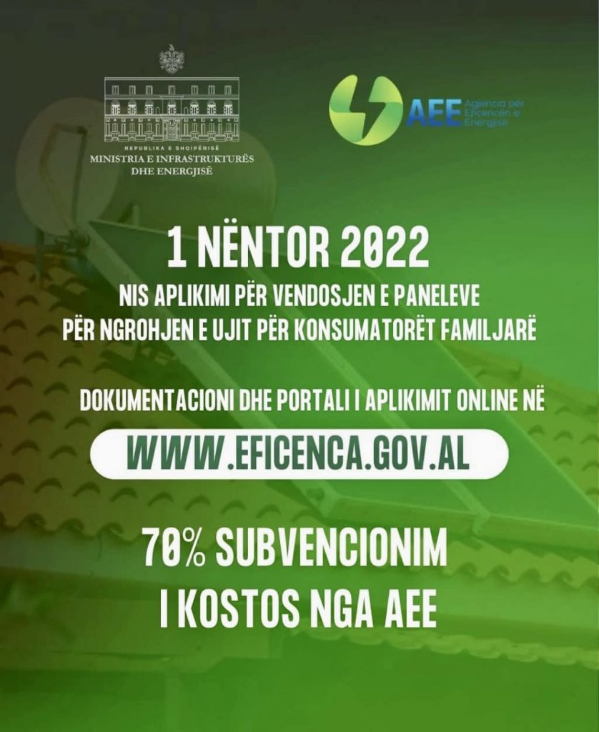Kryeministri, Edi Rama, ka bërë me dije përmes një postimi në facebook, se duke filluar nga data 1 nëntor do të nisë aplikimi për vendosjen e paneleve për ngrohjen e ujit për konsumatorin.