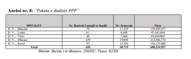 Ndërsa nga auditimi i kryer nga KLSH ka rezultuar se nuk është realizuar numri i seancave të dializës sipas projeksionit mujor kryesisht në qendrat e dializës Shkodër e Vlorë si dhe për disa muaj në atë Lezhës, për arsye të numrit më të ulët të pacientëve se sa projeksioni. Në qendrën e Elbasanit ka tejkalim të numrit të trajtimeve të përcaktuara në kontratë dhe kjo llogaritet të ketë një vlerë rreth 150 mijë euro.