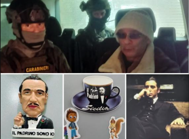 Në banesën e tij u gjetë foto kafshësh të egra, magnet frigoriferi me imazhin e një shefi me smoking që të kujton Al Pacinon tek “Kumbari” dhe me fjalët “Unë jam kumbari”. Krahas picave, dokumenteve dhe letrave, pra, Karabinierët del Ros gjetën një sërë objektesh që i referohen filmit të famshëm.