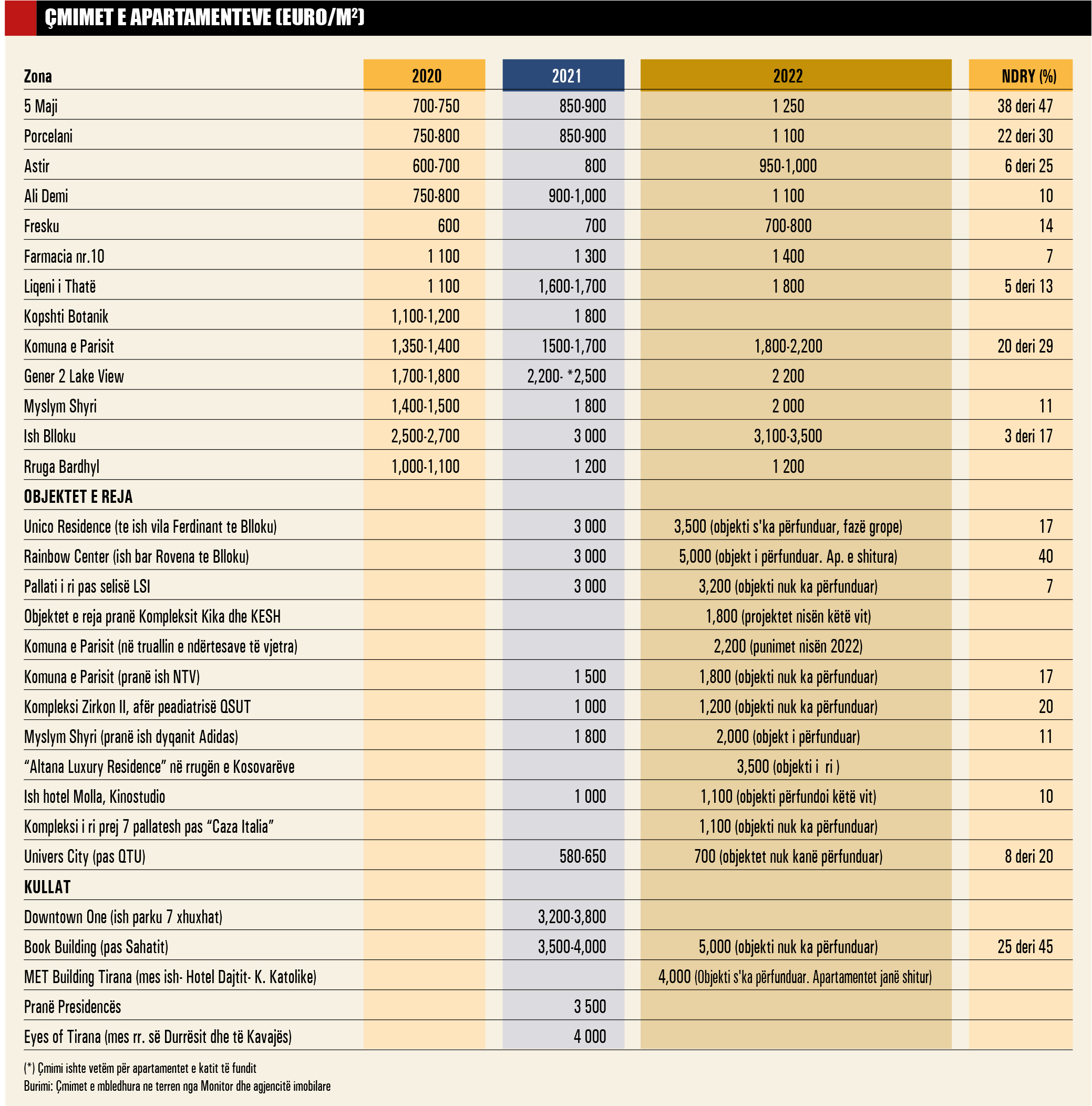 Çmimet e apartamenteve në Tiranë janë rritur nga 200 deri në 700 euro më shumë se në vitin 2021. Çmimi i apartamenteve në zonën e ish- Bllokut dhe kullave arrin në 5,000 euro/m². Shoqata e Ndërtuesve thotë se rritja është ndikuar nga shtrenjtimi i materialeve të ndërtimit dhe kërkesa e lartë për shtëpi. Por shtrenjtimi i çmimeve po ul leverdinë nga qiraja, si për shtëpitë në qendër, ashtu edhe në periferi. Rritja e normave të interesit të kredive pritet të tkurrë kërkesën, gjë që mund të sjellë edhe rënie të çmimeve.