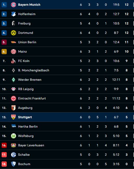Katër skuadra ndodhen në kuotën e 12 pikëve në renditjen e Bundesligës, me Bajernin, Hofenhaimin, Fraiburgun dhe Dortmundin që udhëheqin së bashku kampionatin.