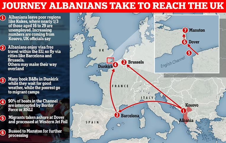 Shqiptarët kanë shijuar udhëtimin pa viza me BE-në që nga viti 2010, duke lejuar shumicën e emigrantëve të arrijnë në veri të Francës me fluturime përmes qyteteve si Barcelona dhe Brukseli. Pasi kanë mbërritur pranë bregut të Kanalit, shumica rezervojnë hotele të lira, ndërsa më të varfërit bashkohen me azilkërkuesit nga vendet e tjera në kampet jashtë Calais.