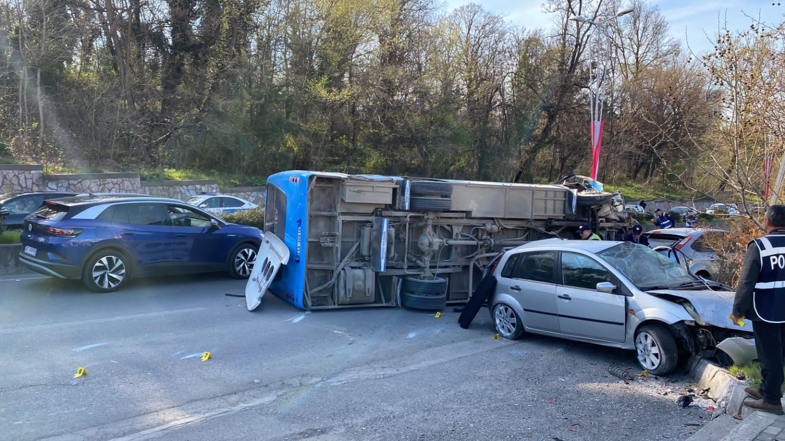 Një autobus që vinte nga Kërraba humbi drejtimin dhe u përmbys në rrugë, duke marrë përpara dy makina të tjera, e si pasojë la 3 persona të lënduar. Megjithatë fatmirësisht jashtë rrezikut për jetën. Drejtuesi i mjetit u shoqërua në Policinë e Shtetit, Gentjan Qosja ka deklaruar se nuk ka arritur të mbajë kontrollin e autobusit teksa po udhëtonte në rrugën e pjerrët, pak pasi kaloi Pallatin e brigadave.