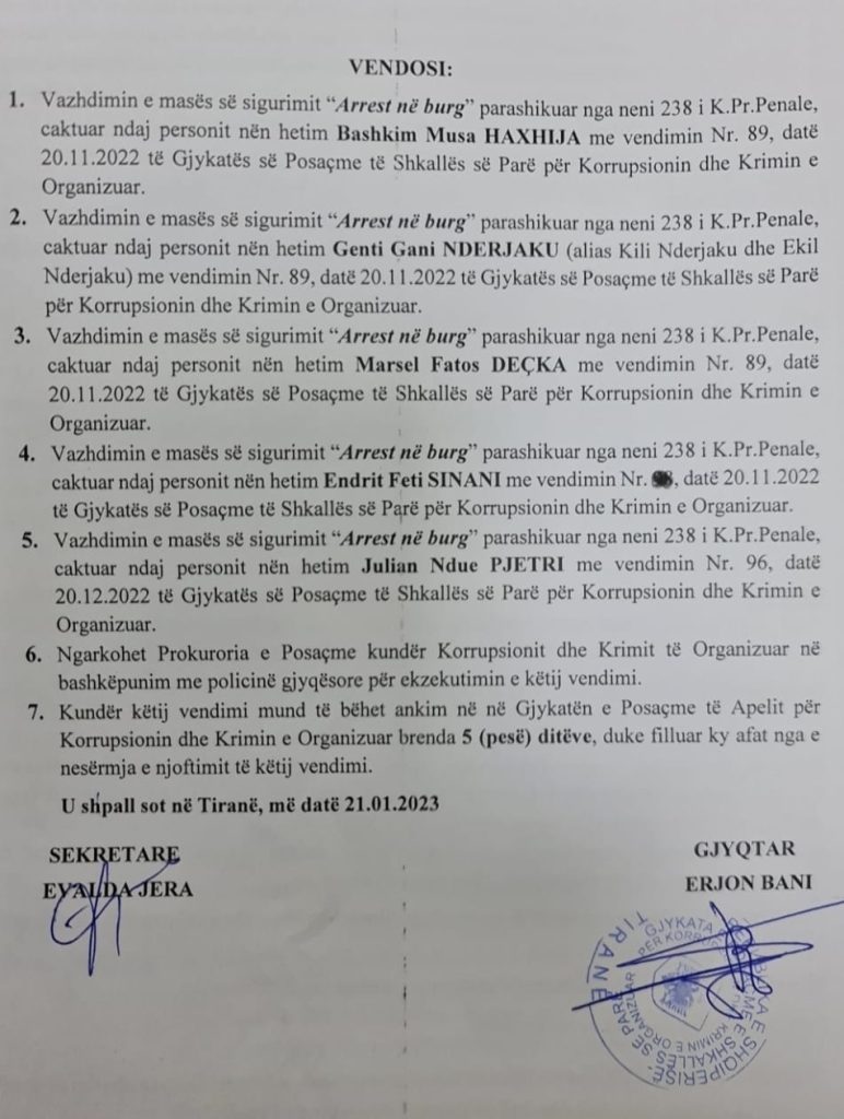 Gjykata e Posaçme GJKKO ka dhënë masën e sigurisë “arrest me burg” këtë të shtunë për pesë të arrestuarit të akuzuar për atentatin ndaj ish-prokurorit Arjan Ndoj.