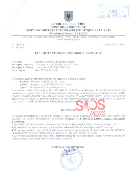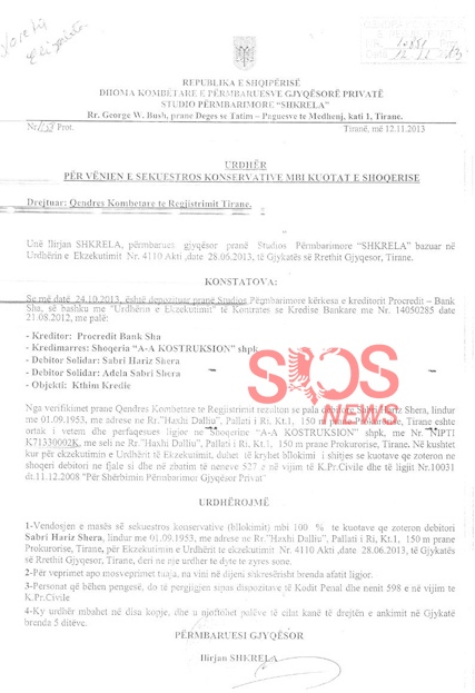 Më poshtë sosnews sjellë disa prej dokumentave faksmilie të urdhërave përmbarimorë të lëshuar nga gjykata në ngarkim të Sabri dhe Adela Shera/
