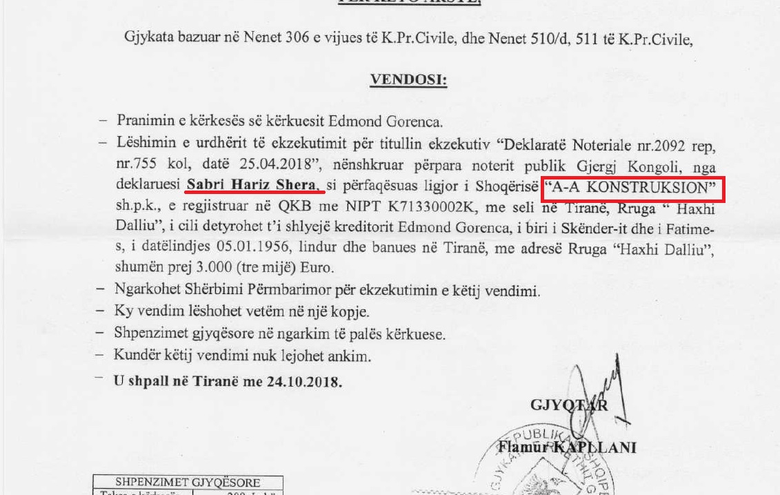 Sabri Shera administrator i kompanisë A-A Konstruksion që prej vitit 2004 rezulton se është në telashë të forta ligjore për shkak të detyrimeve të shumta të akumuluara ndaj kompanive të treta që ishin kontraktuar për ndërtimin e pallatit, por edhe ndaj blerësve të apartamente të cilëve nuk iu është dhënë as apartamenti i premtuar por as lekët e pagauara mbrapsht.