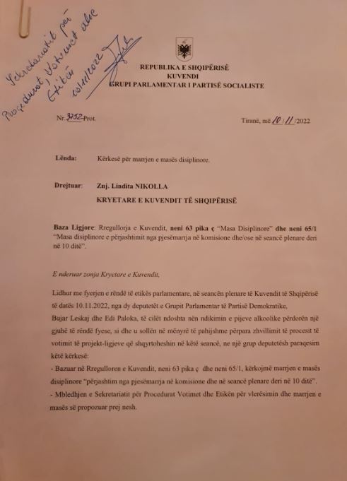 Lidhur me fyerjen e rëndë të etikës parlamentare, në seancen plenare të Kuvendit të Shqipërisë të datës 10.11.2022, nga dy deputetët e Grupit Parlamentar të Partisë Demokratike, Bujar Leskaj dhe Edi Paloka, të cilët ndoshta nën ndikimin e pijeve alkoolike përdorën një gjuhë të rëndë fyese, si dhe u sollën në mënyrë të pahijshme përpara zhvillimit të procesit të votimit të projektligjeve që shqyrtoheshin në ketë seancë, ne një grup deputetësh paraqesim këtë kërkesë: