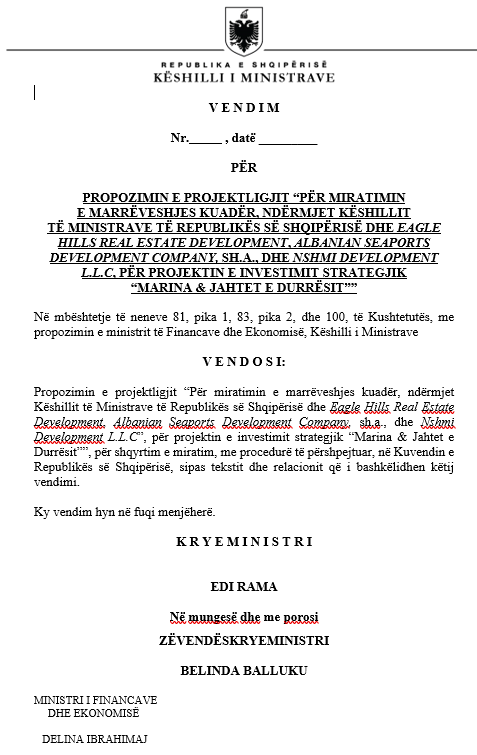 Qeveria i kërkoi Parlamentit sot të shqyrtojë me procedurë të përshpejtuar marrëveshjen me kompanitë “Eagle Hills Real Estate Development, Albanian Seaports Development Company”, sh.a., dhe “Nshmi Development L.L.C”, për ndërtimin e portit Portit të Durrësit.