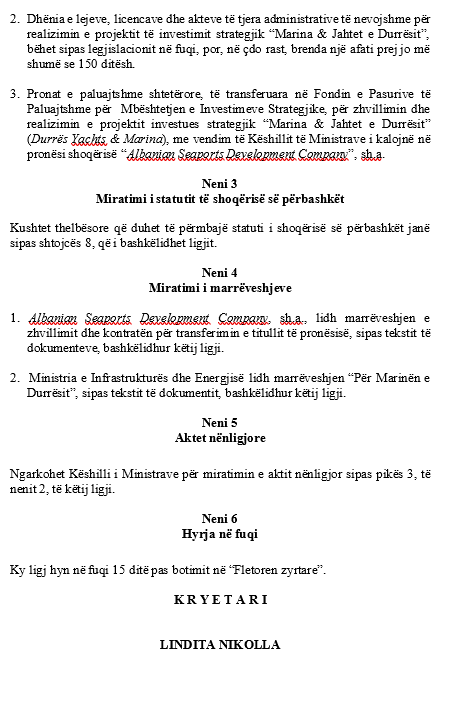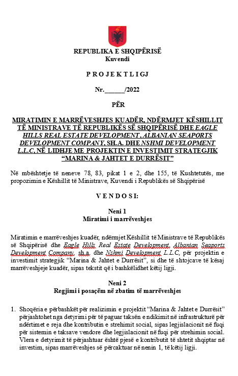 “Shoqëria e përbashkët për realizimin e projektit “Marina & Jahtet e Durrësit” përjashtohet nga detyrimi për të paguar taksën e ndikimit në infrastrukturë për ndërtimet e reja dhe kontributin e strehimit social, sipas legjislacionit në fuqi për sistemin e taksave vendore dhe legjislacionit në fuqi për strehimin social. Vlera e detyrimit të përjashtuar është pjesë e kontributit të shtetit shqiptar në investim, sipas marrëveshjes së përcaktuar në nenin 1, të këtij ligji”, thuhet në projektligj.
