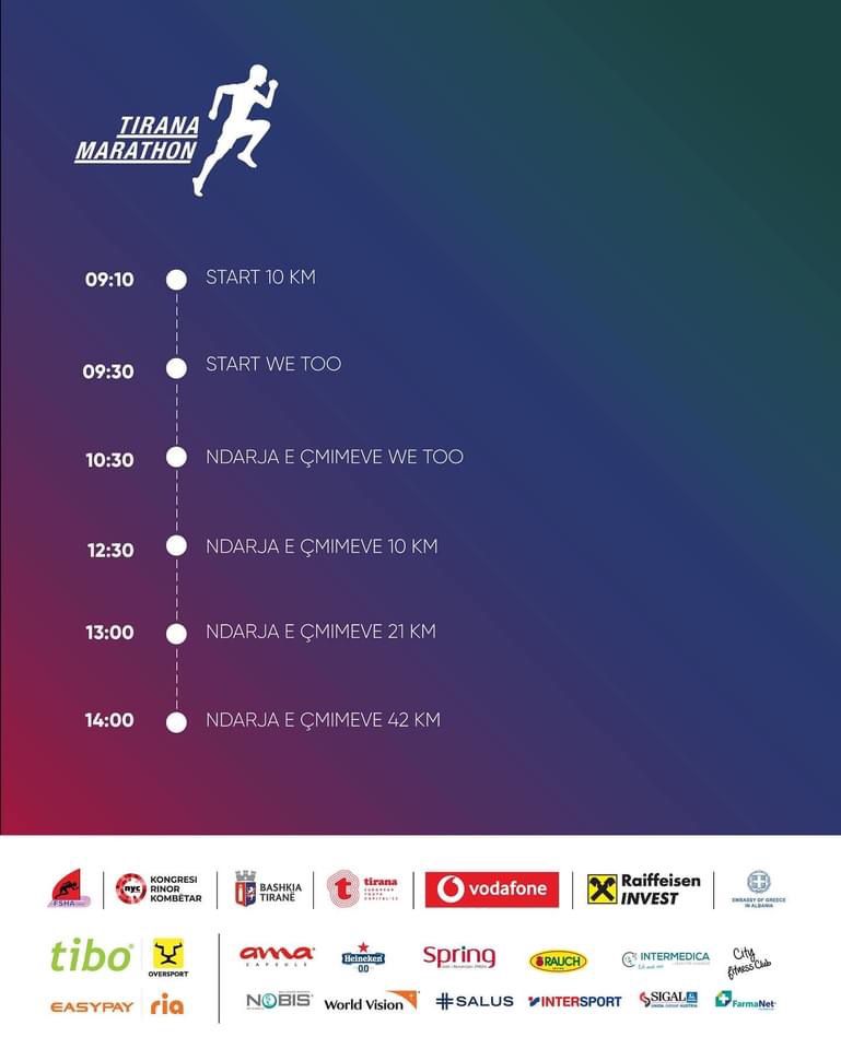 Sot do të startojë Maratona e Tiranës 2022, eventi më i madh sportiv në qytet, që këtë vit vjen me edicionin e saj të 6-të. Në këtë garë marrin pjesë rreth 2500 vrapues nga e gjithë bota dhe ajo është është e ndarë në katër kategori: “Marathon” gara e plotë që i dedikohet profesionistëve, “Half Marathon”, për ata që duan të sfidojnë veten, “Tirana 10K” ku garojnë kryesisht të apasionuarit pas maratonave, por jo profesionistë dhe kategoria “We Too” që është gara për personat me aftësi ndryshe.