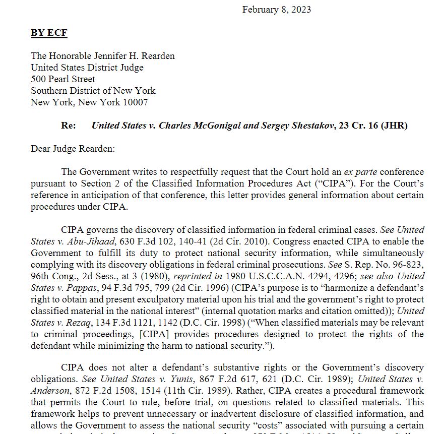 Prokurorët që po ndjekin çështjen e ish-agjentit të FBI-së Charles McGonigal që lidhet me dosjen e rusit Oleg Deripaska kanë kërkuar që një pjesë e gjyqit të jetë sekret, pasi nuk të kompromentohej siguria kombëtare. Në dokumentin e shkruar, drejtuar gjyqtarit Jennifer Rearden, të publikuar nga gazetari Klodian Tomorri përmendet vetëm kjo kërkesë.