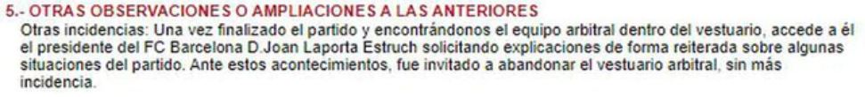 “Pasi mbaroi ndeshja dhe ekipi i arbitrave gjendej brenda dhomës së zhveshjes, hyri presidenti i Barcelonës, Joan Laporta, duke kërkuar vazhdimisht shpjegime për disa situata në ndeshje”, shkruante në protokoll gjyqtari pas sfidës.
