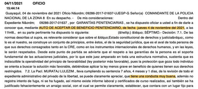 Avokati Pablo Encalada shpjegoi për Infobae se kapoja shqiptar ishte në gjendje të përfitonte nga lirimi sepse ashtu e diktonte Kodi Penal, edhe pse shtoi: Nuk është e drejtë, por është ligjërisht ajo i takonte.