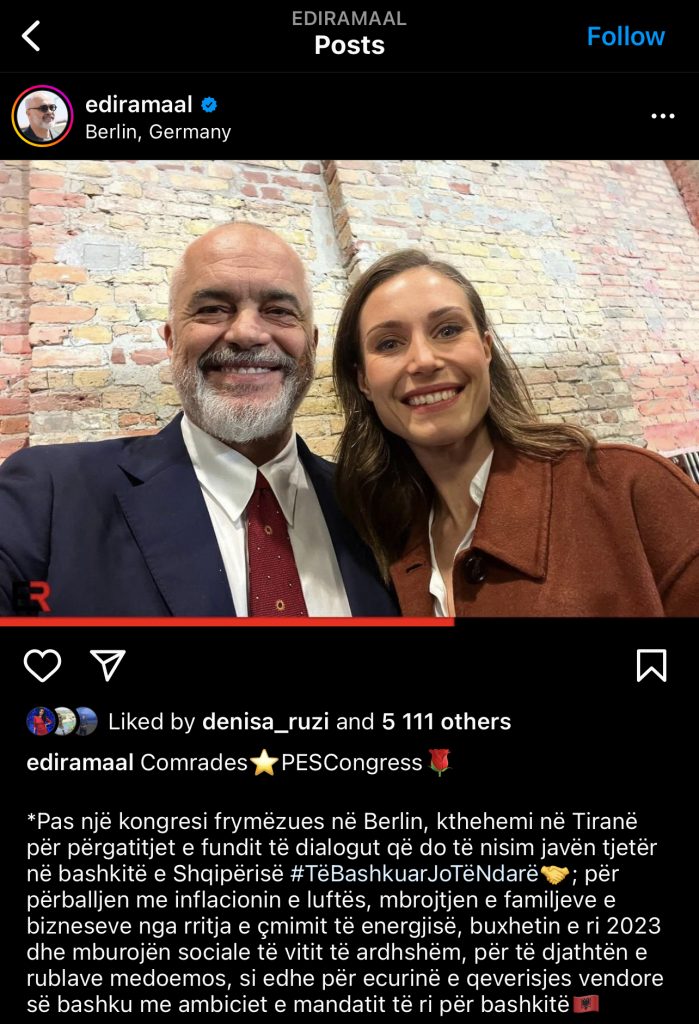 ryeministri Edi Rama ka njoftuar se do të kthehet në Tiranë, pas përfundimit të Kongresit të Berlinit. Këtë e ka bërë të ditur teksa ka ndarë një foto me kryeministren e Finlandës, Sanna Marin. Rama deklaron se sapo të kthehet në Tiranë do të nisë përgatitjet e fundit për dialog në lidhje me Bashkitë e Shqipërisë. Ai shton se do të diskutojnë për përballjen me inflacionin e luftës, mbrojtjen e familjeve e bizneseve nga rritja e çmimit të energjisë, buxhetin e ri 2023 dhe mburojën sociale të vitit të ardhshëm.