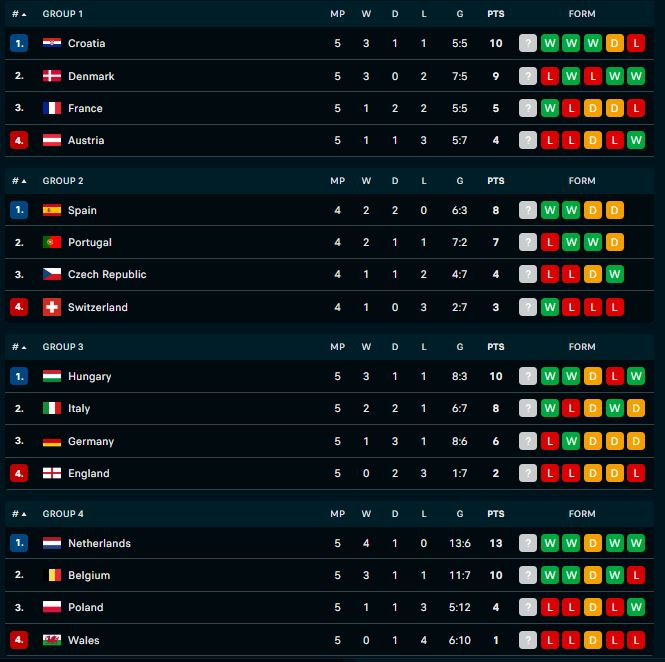 Me vetëm dy pikë në renditje, Anglia e ka të sigurt vendin e fundit, pasi Gjermania, që u mposht nga Hungaria, ka grumbulluar 6 pikë me vetëm një ndeshje për t’u luajtur.