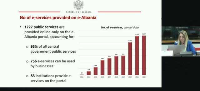 Romina Kostani, drejtore e Inovacionit dhe Promovimit e-Gov, bëri më dije zhvillimet që ka njohur Shqipëria në kuadër të digjitalizimit, në mënyrë specifike me shërbimet elektronike të e-Albanias, ndërsa theksoi se me mbylljen e përfundimtare të sporteleve fizike nga maji i vitit të kaluar, jo vetëm është kursyer kohë dhe para, por është evituar fenomeni i korrupsionit, kurse standardi i komunikimit mes zyrave të shtetit dhe qytetarëve është rritur ndjeshëm.