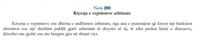 Konkretisht, neni 250 lexon se: Kryerja e veprimeve ose dhënia e urdhrave arbitrare, nga ana e punonjësit që kryen një funksion shtetëror ose një shërbim publik gjatë ushtrimit të detyrës së tij, të cilat prekin lirinë e shtetasve, dënohet me gjobë ose me burgim gjer në shtatë vjet.