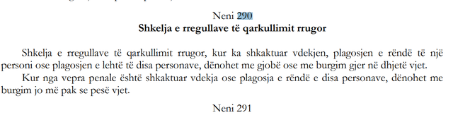 Ndërsa neni 290: Shkelja e rregullave të qarkullimit rrugor, kur ka shkaktuar vdekjen, plagosjen e rëndë të një personi ose plagosjen e lehtë të disa personave, dënohet me gjobë ose me burgim gjer në dhjetë vjet. Kur nga vepra penale është shkaktuar vdekja ose plagosja e rëndë e disa personave, dënohet me burgim jo më pak se pesë vjet.