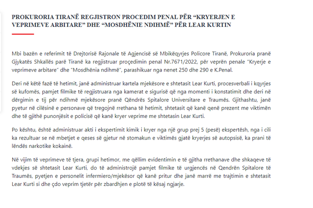 Prokuroria e Tiranës ka shpërndarë një deklaratë për mediat, ku bëhej me dije se kishin nisur një procedim penal për vdekjen e Lear Kurtit. Në njoftimin zyrtar shkruhej se sipas Prokurorisë, veprat penale për të cilat do të gjykohen efektivët e Policisë së Shtetit, parashikohen në nenet 250 dhe 290 të Kodit Penal.