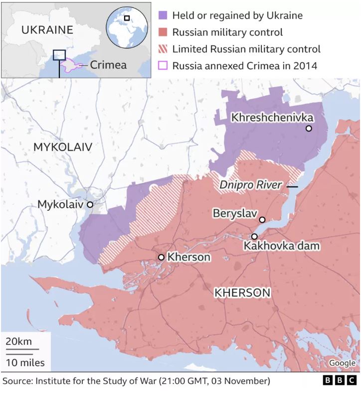 Edhe pse përparimi ukrainas ishte ngadalësuar javët e fundit, linjat e furnizimit të Rusisë nëpër lumin Dnipro ishin bërë gjithnjë e më të vështira, pas shkatërrimit të urave nga forcat ukrainase.