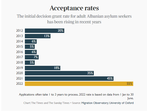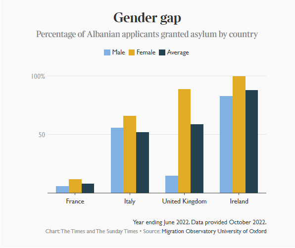 Në 12 muajt deri në qershor, pothuajse 7745 shqiptarë (përfshirë personat në ngarkim) aplikuan për azil këtu. Vetëm 15 për qind e burrave ishin të suksesshëm, krahasuar me 89 për qind të grave, sipas Observatorit të Migracionit të Universitetit të Oksfordit. Në gjashtë muajt e parë të vitit shkalla e përgjithshme e pranimit ishte 55 për qind, duke e bërë Britaninë një perspektivë shumë më tërheqëse se vendet e tjera si Franca – e cila pranoi vetëm 8 për qind – ose Suedia apo Greqia, të cilat nuk pranuan asnjë. Vetëm Italia dhe Irlanda pranuan një përqindje më të lartë të kërkesave për azil nga Shqipëria sesa MB; Megjithatë, shumë më pak aplikohen.