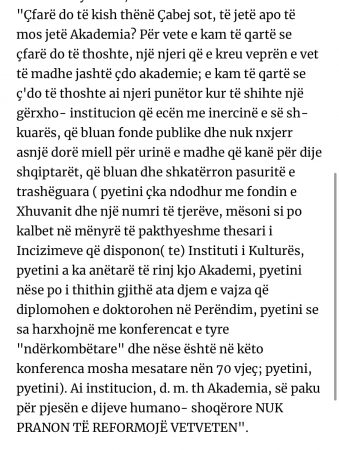 Po mua më vjen disi krupë nga kjo palo-fjalë se kjo fjalë më kap për zverku e më shpie drejt e te Pleniumi i KQ PPSH, i motit 1972, kur me vendim Byroje e me porosi të vetë Enver Qoftëlaegut u ngrit kjo Akademi. Edha vanë e ja shkrepën një foto Çabejt atë ditë edhe e vunë në çdo vend si për të thënë që ja, i madhi i shkencës është me Akademizmën e Partisë. Ndërkohë që kjo palo Akademizmë as për së gjalli e as për së vdekuri nuk ia botoi e nuk ia boton veprën e madje Mesharin, veprën e jetës ia kalbi magazinave.