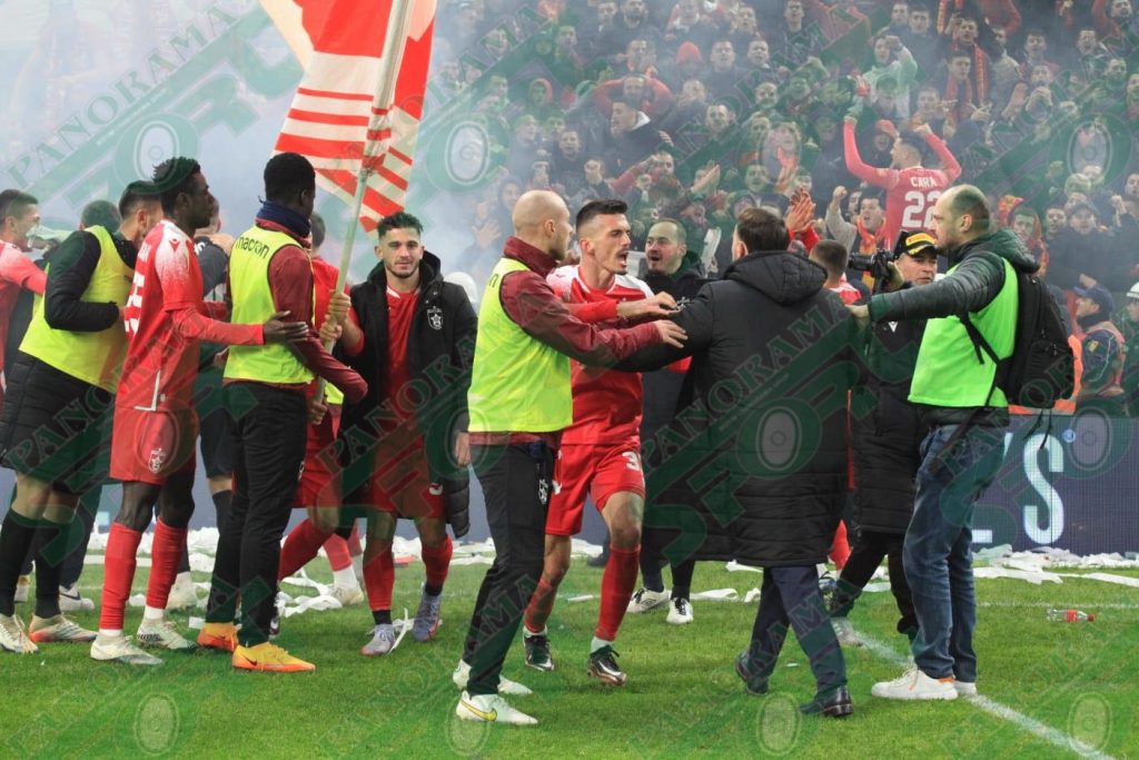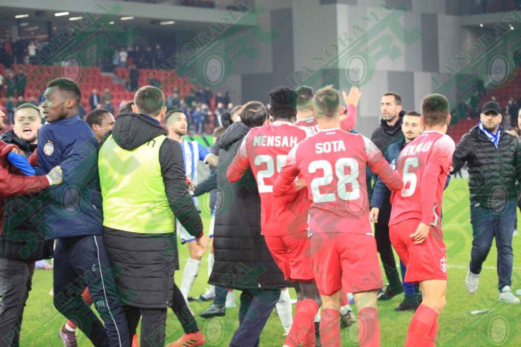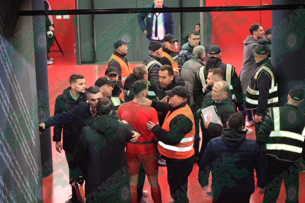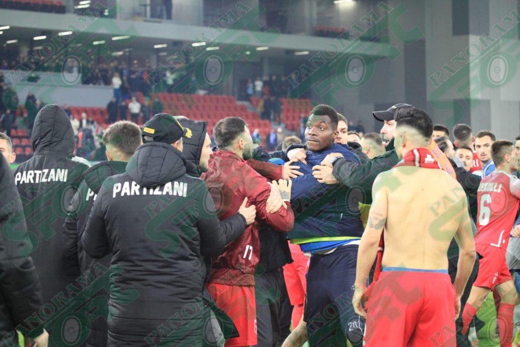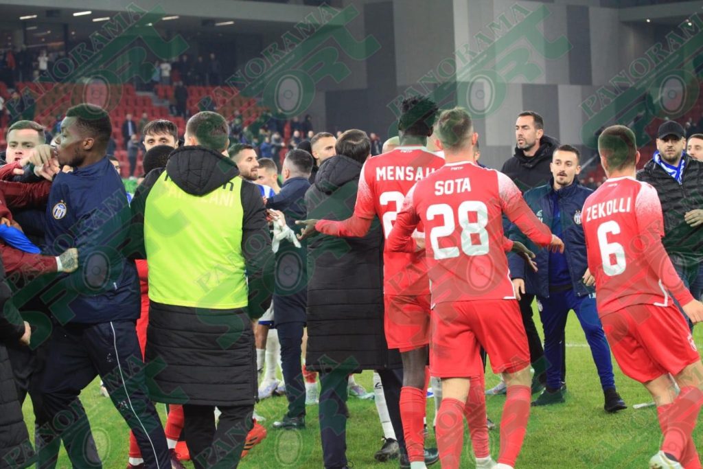 *Në fund Murataj merr një flamur të kuq për ta vendosur në qendër të fushës. Aleksi dhe Osmani vrapojnë ta ndalojnë, por pak sekonda më pas nis një sherr masiv, ku përfshihen të gjithë, teksa ka edhe tifozë që hyjnë në fushë. Tensioni zgjat për disa minuta, me protagonistët që janë të shumtë. Nëse në fushë gjendja u qetësua momentalisht, në dhomat e zhveshjes tensioni u rikthye. Nga fotot duket se Skuka ka pasur një përplasje me drejtorin e Tiranës, Tefik Osmani. Ndërkohë, një tjetër incident serioz mësohet të ketë ndodhur mes mesfushorit të Partizanit, Valentino Murataj, dhe mbrojtësit të Tiranës, Zhoselin Behiratçe, i cili ka marrë një goditje me grusht nga fieraku i të kuqve.