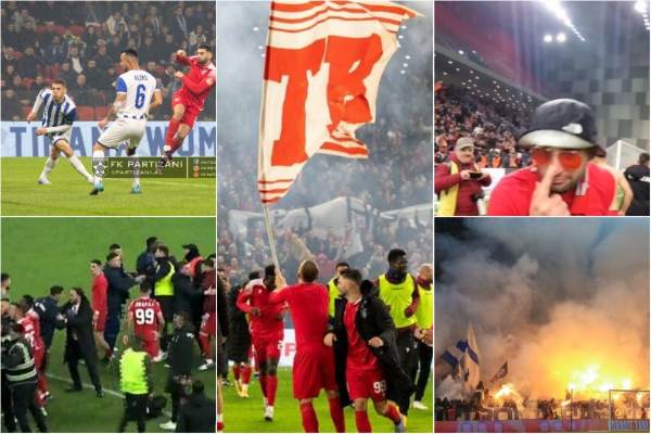*Tifozët e Partizanit mbushin pjesën para portës me letra dhe shirita. Detyrohen t’i pastrojnë vetë lojtarët e Partizanit dhe zjarrfikësit. Ndeshja nis tetë minuta me vonesë.