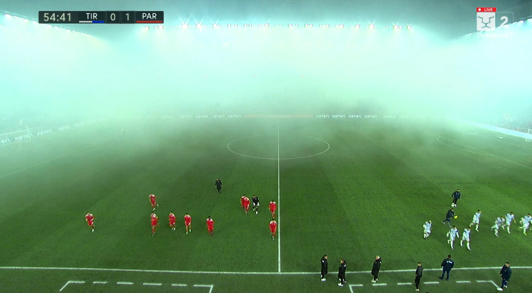 *Tymuese pafund dhe fishekzjarrë që i drejtohen fushës në nisje të pjesës së parë. Gjyqtari Eldorjan Hamiti urdhëron lojtarët të futen në dhomat e zhveshjes. Lojtarët kërkojnë vazhdimin e lojës. Më pas të kuqtë futen, ndërsa Tirana qëndron edhe për disa sekonda jashtë, por më pas detyrohet të zbatojë urdhrin. Pas rreth 13 minutash tym e flakë, skuadrat rikthehen në aksion.