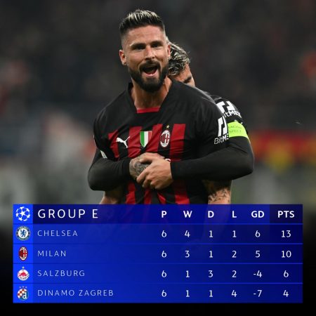 Me fillimin e pjesës së dytë, Giroud bëri spondën në zonë për Krunic që me kokë dyfishojë shifrat. “Demat” austriak u dorëzuan pa kushte, në të 57-tën, Guroud kompletoi “dopjetën” personale dhe golin e tretë për Milan. Në shtesë, kishte kohë edhe Messias që me një aksion të bukur personal kompletoi “pokerin” kuqezi. Milan e mbyll Grupin E në vendin e dytë, në kuotën e 10-të pikë, 3 më pak se Chelsea:“Jemi kampionët e Italisë, nuk duhet të kemi frikë, duhet të ecim përpara sa më larg të jetë e mundur. Shorti do të jetë i vështirë, por e sigurt është se çdo skuadër që do të jetë përballë nesh duhet të bëjë llogaritë me një Milan bindës”, u shpreh Pioli pas ndeshjes.