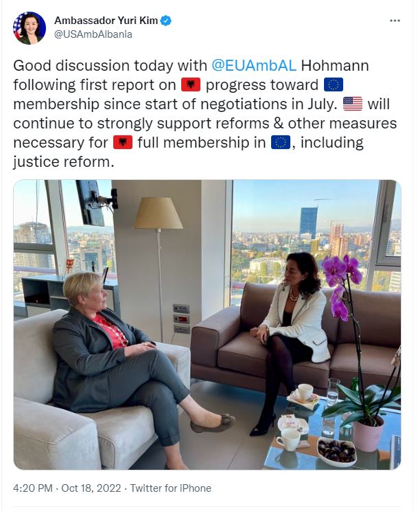Diskutim i mirë sot me ambasadoren Hohmann pas raportit të parë mbi përparimin e Shqipërisë drejt anëtarësimit në BE që nga fillimi i negociatave në korrik. SHBA do të vazhdojë të mbështesë fuqishëm reformat dhe masat e tjera të nevojshme për anëtarësimin e plotë të Shqipërisë në BE, përfshirë reformën në drejtësi.