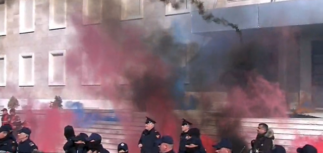 Protestuesit kanë hedhur shashka, tymuese e molotov në drejtim të Kryeministrisë, duke ndezur flakë në shkallët e institucionit. Sulmi ndaj kryeministrisë ka nisur sapo kreu i Partisë Demokratike Sali Berisha përfundoi fjalimin para turmës, ndërsa njoftoi që edhe të hënën do të kishte një tjetër protestë para Parlamentit të Shqipërisë.