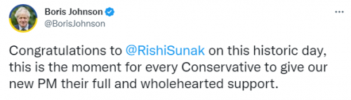 “Urime për Rishi Sunak në këtë ditë historike, ky është momenti që çdo konservator t’i japë kryeministrit tonë të ri mbështetjen e plotë dhe të përzemërt”, shkroi Boris Johnson.