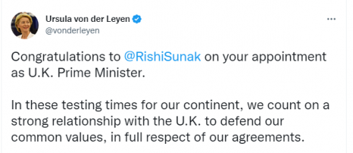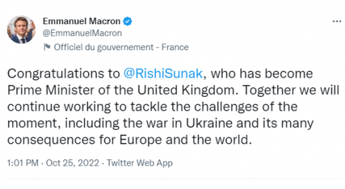 Pas tij, ka reaguar presidenti francez Emmanuel Macron, i cili shkroi: “Urime për Rishi Sunak, i cili është bërë kryeministër i Mbretërisë së Bashkuar. Së bashku do të vazhdojmë të punojmë për të trajtuar sfidat e momentit, duke përfshirë luftën në Ukrainë dhe pasojat e saj të shumta për Evropën dhe botën.”