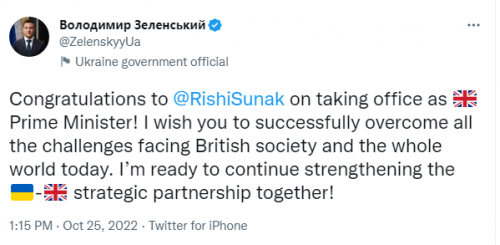 Presidenti i Ukrainës, Volodymyr Zelensky, gjithashtu ka përgëzuar Rishi Sunak, duke shtuar se shpreson që kryeministri i ri të kapërcejë me sukses “të gjitha sfidat me të cilat përballet shoqëria britanike dhe bota sot”.