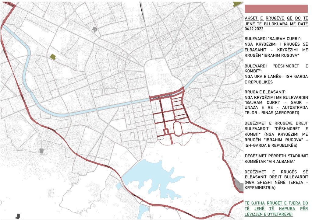 -Gjithashtu, të gjitha rrugën që lidhin rrugën e Elbasanit, me rrugët “Papa Gjon Pali II”, “Dervish Hima”, “Asim Zeneli”, “Themistokli Gërmenji”, “Ismail Qemali”, “Mustafa Matohiti”, “Jul Variboba”, “Faik Konica”, “Fatmir Haxhiu”, “Gjeneral Nikols”, rrugën e Atjonit, “Sheh Ahmet Pazar”, si dhe të gjitha rrugët që lidhin bulevardin “Dëshmorët e Kombit” me rrugët “Ibrahim Rugova”, “Ukraina e lirë” dhe “Lek Dukagjini”, do të jenë të bllokuara.