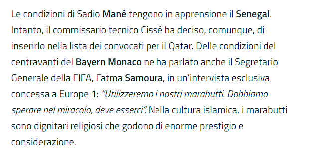 Sadio Mane u ftua nga Senegali për Kupën e Botës në Katar, por përsëri nuk dihet akoma nëse sulmuesi do të luajë apo jo pasi është i dëmtuar. Te kjo përfaqësuese duket se do përdorin të gjitha mënyrat e mundshme për të bërë që ylli i tyre të jetë në fushë, madje madje, do provojnë edhe të mbinatyrshmen, magjinë.