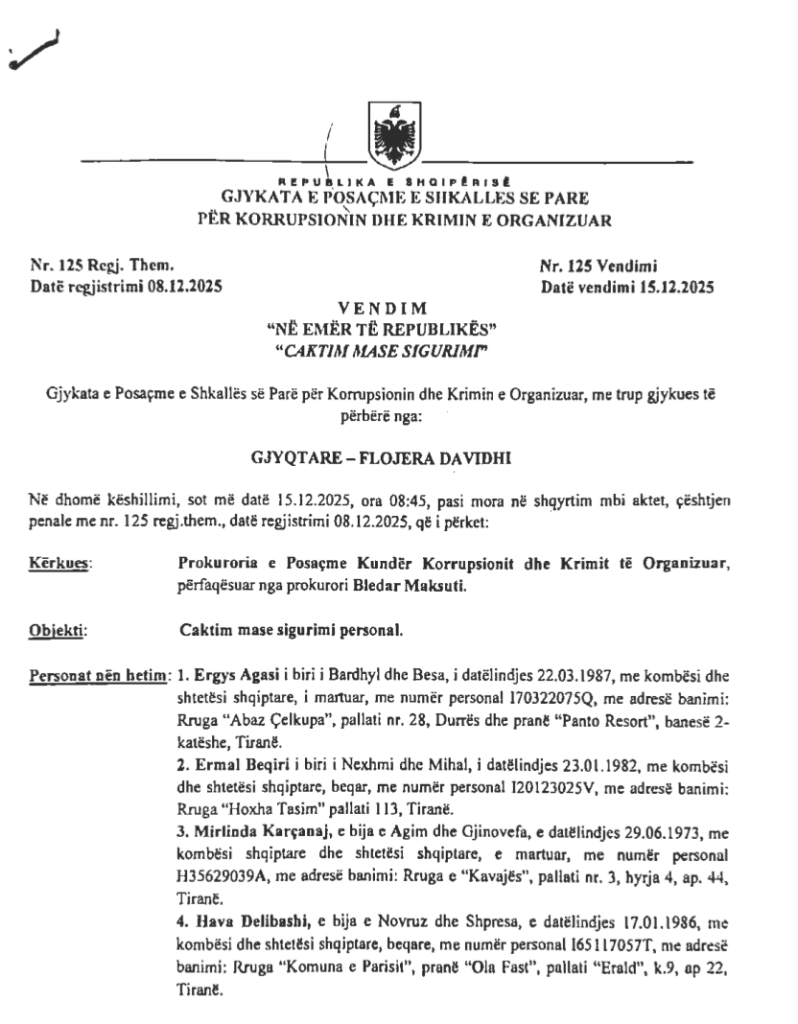Shënim: Ky shkrim u hartua bazuar ekskluzivisht në përmbajtjen e dosjes hetimore zyrtare të SPAK dhe në vendimin e Gjykatës së Posaçme për masat e sigurisë ndaj të pandehurve të lartpërmendur. Të gjitha faktet, citimet dhe përshkrimet e mësipërme mbështeten në këto dokumente zyrtare, duke ofruar një pasqyrë të plotë të ngjarjeve të zbardhura nga organet e drejtësisë.