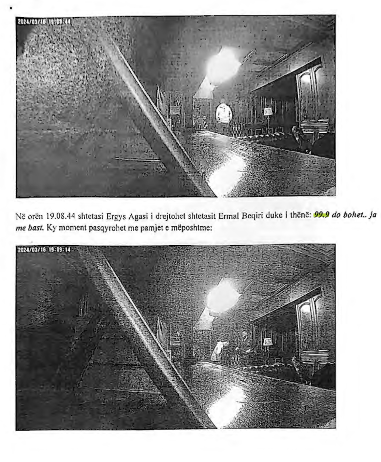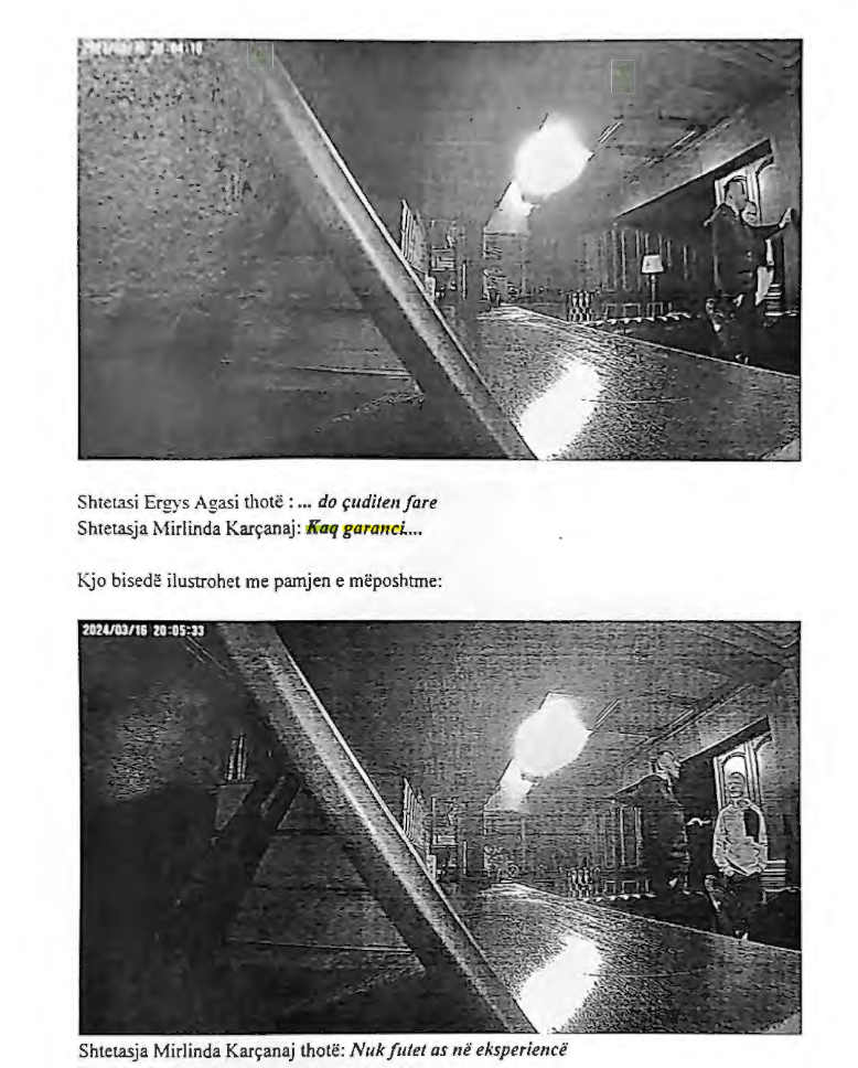 Fotoja tregon drejtoreshën Mirlinda Karçanaj (majtas) duke u takuar me biznesmenin Ermal Beqiri (djathtas) në ambientet e lokalit “EA Tobacco” në Tiranë, më 16 mars 2024. Pamjet filmike dhe fotografike të siguruara nga hetuesit konfirmojnë takime të shumta të fshehta mes zyrtarëve publikë dhe biznesmenëve, ku dyshohet se diskutoheshin detajet e manipulimit të tenderëve. Në këtë rast, sipas përshkrimit të dosjes, Karçanaj dhe Beqiri po flisnin për kriteret e një procedure që kishin planifikuar të shpallnin. “Kaq garanci…” – dëgjohet t’i thotë Karçanaj Beqirit, ndoshta duke iu referuar garancisë bankare për ofertuesit; ndërsa në një moment tjetër ajo shton: “Nuk futet as në eksperiencë” – duke diskutuar eliminimin e një kriteri përvojë nga kushtet e tenderit. Këto dialogë, të ilustruar me fotot respektive nga vendngjarja, tregojnë qartë sesi zyrtarja e lartë dhe biznesmeni i favorizuar bashkëpunonin hapur për të formësuar tenderin sipas dëshirës së tyre, përpara se ky tender të hapej zyrtarisht për publikun.