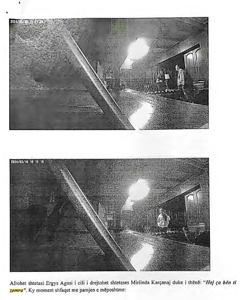 - Video-survejimet dhe fotot ishin një tjetër aset i çmuar hetimor. Ekipet e Byrosë Kombëtare të Hetimit (BKH) kishin arritur të vendosnin pajisje të fshehta regjistrimi në ambientet ku grupi takohej rëndom. Për muaj me radhë, kamera të maskuara regjistruan takime konspirative në zyra private, kafene dhe ambiente të tjera. Këto video u analizuan frame më frame, dhe prej tyre hetuesit nxorën momentet kryesore – duke fiksuar imazhe kyçe dhe duke përgjuar dialogët përkatës. Për shembull, në një takim më 17 janar 2024, Mirlinda Karçanaj shfaqet duke hyrë në zyrën private të Ergys Agasit (“EA Tobacco”) dhe aty e pret Ermal Beqiri. Në pamjet e filmuara (ora 16:55–17:55 atë ditë) konfirmohet prania fizike e Karçanajt pranë Agasit, e cila korrespondon në kohë me bisedat e tyre të përgjuara ku diskutohej për “procedurat SPA që na çojti Adela” – referencë e dukshme për Procedurat e Prokurimit të Përshpejtuara (SPA). Një tjetër sekuencë filmike tregon Karçanajn dhe Beqirin teksa bisedojnë në një ambient gjysmë-të errët (gjithnjë nën vëzhgim), kur papritur u bashkohet Agasi që i afrohet dhe e përshëndet drejtoreshën me një familjaritet të tepruar: “Hejj, të bëfsha zemra!” – i thotë ai, ndërsa ulet pranë tyre.