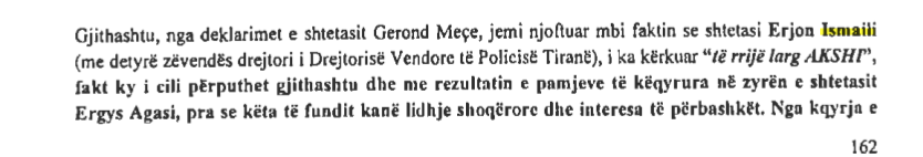 Erjon Ismaili – Rasti bëhet veçanërisht tronditës kur zbulohet se në grup ishte përfshirë edhe një funksionar i lartë i Policisë së Shtetit. Erjon Ismaili (46 vjeç) gjatë periudhës në hetim mbante detyrën Zv/Drejtor i Policisë Vendore Tiranë. Duke qenë në këtë pozicion, ai kishte qasje tek informacionet hetimore konfidenciale dhe një ndikim të madh te forcat e rendit. Sipas provave, Ismaili e përdori pushtetin e tij për të favorizuar grupin kriminal dhe frikësuar kundërshtarët e tyre. Në fillim të vitit 2025, ai personalisht – qoftë drejtpërdrejt, qoftë përmes ndërmjetësve – paralajmëroi pronarin e kompanisë ABS, Gerond Meçe, që “të rrinte sa më larg AKSHI-t”.