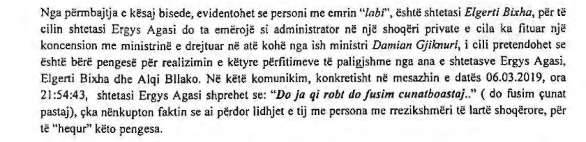 - Gjurma financiare: Përveç përgjimeve dhe survejimit, hetimi ndoqi edhe qarkullimin e parave. U zbuluan transferta bankare dhe pagesa të dyshimta mes kompanive të përfshira. Andis Papa, në cilësinë e nënkontraktorit formal, kishte kryer pagesa të mëdha (mbi 1.5 milionë euro) drejt një kompanie fantazmë të kontrolluar nga grupi, pa justifikim të qartë ekonomik. Po ashtu, analiza e llogarive tregoi pasurinë e papritur të disa prej zyrtarëve: Ergys Agasi, p.sh., rezultoi me investime në pasuri të paluajtshme dhe biznese që nuk përputheshin me të ardhurat e deklaruara. Këto janë indikatorë tipikë të pastrimit të parave, ku paratë e korrupsionit riciklohen në prona ose biznese për të fshehur origjinën e tyre kriminale. Një element interesant që doli nga përgjimet ishte përmendja e një personazhi me pseudonimin “Labi” – hetuesit zbuluan se ky ishte shtetasi Elgerti Bixha, mik i ngushtë i Ergys Agasit. Në një mesazh të përgjuar që daton që më 6 mars 2019, Agasi, Bixha dhe një i tretë (Alqi Bllako – ish-zyrtar i lartë i akuzuar në një aferë tjetër) diskutojnë për dikë që “po u bëhet pengesë” për përfitimet e tyre të paligjshme dhe shprehen se, nëse situata nuk zgjidhet, “do t’ja q* robt, do fusim çunat, bostanaj”* – një zhargon kërcënues që nënkupton përdorimin e dhunës. Kjo tregon se ky grup kriminal ka qenë aktiv dhe i dhunshëm edhe vite më parë, duke u shtrirë ndoshta në afera të tjera, dhe se kultura e mosndëshkimit u kishte dhënë guximin të shprehnin hapur gatishmërinë për të eliminuar çdo “pengesë” (qoftë ajo person fizik apo ligjor) që dilte kundër tyre.