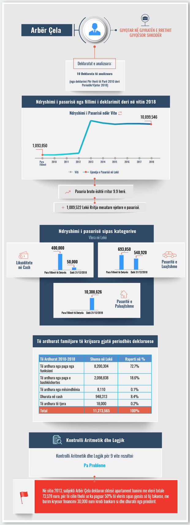 Përveç analizës për rritjen/uljen e pasurisë, strukturën e aseteve dhe të ardhurave, ky raport paraqet dhe kontrollin aritmetik/logjik të deklarimeve të subjektit si dhe “flamujt e kuq’ që identifikohen gjatë kontrollit. Nga kontrolli aritmetik/logjik për 9 vite të deklarimit, asnjë prej deklaratave nuk rezultoi me probleme.