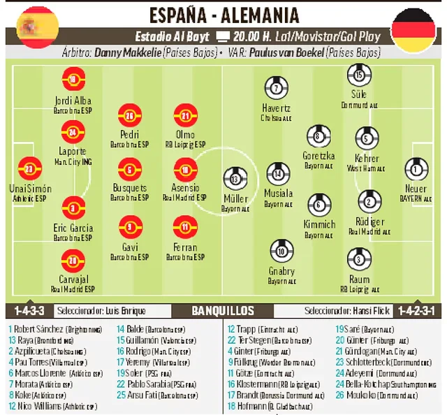 Dueli i ndeshjes? Pedri kundër Musialës. Spanjolli është 20 vjeç dhe gjermani 19. Dy futbollistët më të talentuar në Spanjë dhe Gjermani. Një duel i cilësisë dhe saktësisë më të lartë në mesfushë, pa lënë pas dore as aspektin fizik: dy bisha, me më shumë klas për spanjollin dhe më shumë fuqi për gjermanin. Tema e golit është në pritje për të dy lojtarët: 0 në 15 ndeshje për Pedrin dhe vetëm 1 në 18 ndeshje për Musialën. Futbolli në Spanjë dhe Gjermani kalon nëpërmjet tyre.