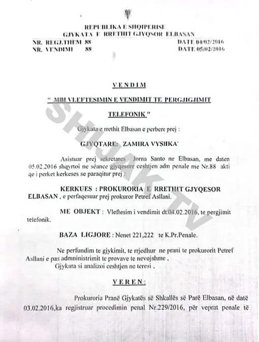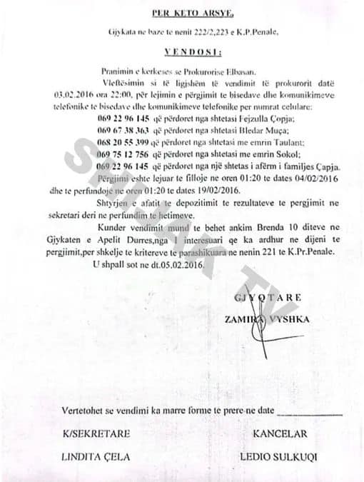 Me vendimin datë 04.02/2016 është autorizuar përgjimi dhe vlerësohet e nevojshme shtyrja e afateve të depozitimit të akteve në sekretari që lidhen me këtë përgjim deri në fund të hetimeve, pasi në të kundërt mund ti vijë një dëm i rëndë hetimeve..