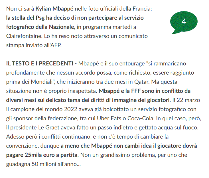 Besohet se Mbappe dhe shoqëruesit e tij mendojnë se imazhet e disa lojtarëve përdoren më shumë se të tjerët. RMC gjithashtu thekson në raportin e tyre se sesioni fotografik për nesër do të përfshinte disa nga sponsorët kryesorë të ekipit kombëtar – si Uber Eats, KFC dhe Coca-Cola.