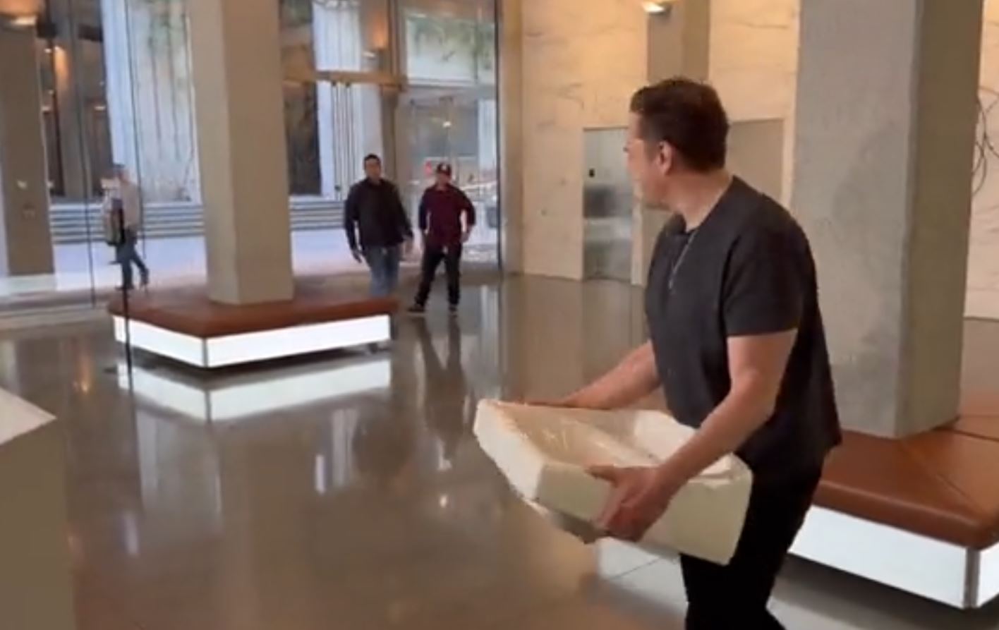 Ajo që të bën përshtypje është fakti se Musk shfaqet duke mbajtur një lavaman, të cilin nuk tregon se pse e ka sjellë në zyrën e tij të re.