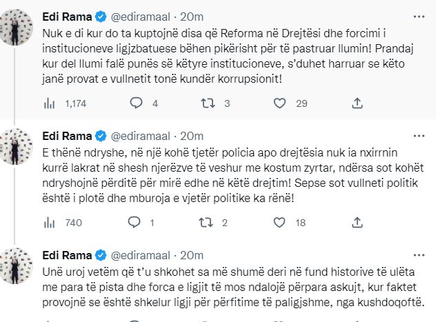 Në një postim në Twitter, Rama tha se forcimi i institucioneve ligjzbatuese po nxjerr në pah edhe llumin e administratës publike.