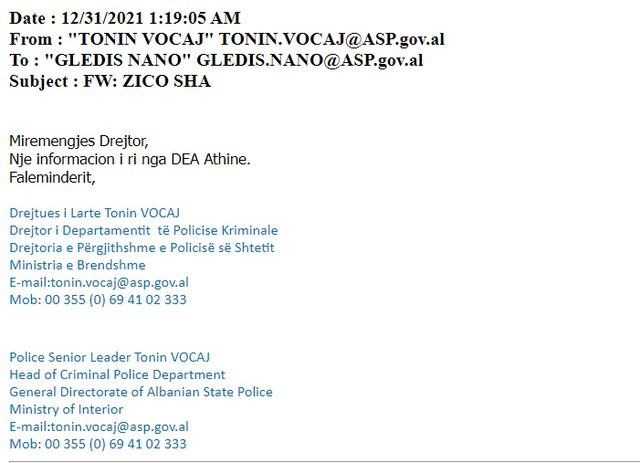 ë tjera e-maile vijojnë të zbardhen pas rrjedhjes së dosjeve sekrete të Policisë së Shtetit, pas sulmit nga hakerat iraninë. Mes e-maileve të ish-drejtorit të Policisë së Shteti, Gledis Nano bie në sy një informacion nga DEA e Athinës, e cila e ka njoftuar PSH për një kompani shqiptare që kryen trafik kokaine nga Ekuadori. E-maili i është përcjellë Gledis Nanos nga Tonin Vocaj 31 dhjetor të vitit 2021 dhe shkruan për një kompani me seli në Durrës, ZICO SHA.
